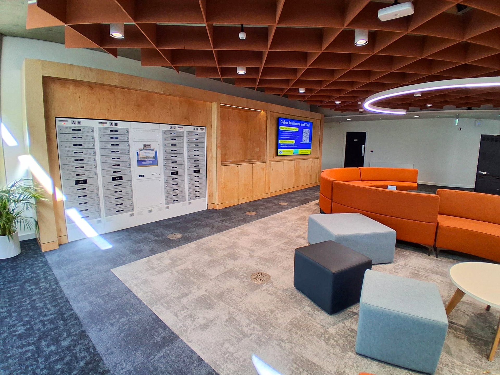 Our team created a standout feature area with tiered seating, providing a versatile space for students and staff to use for collaboration, presentations, or informal gatherings. In addition, we fitted bespoke meeting rooms, which included recessed seating, ensuring each element complemented the university’s modern and professional environment.